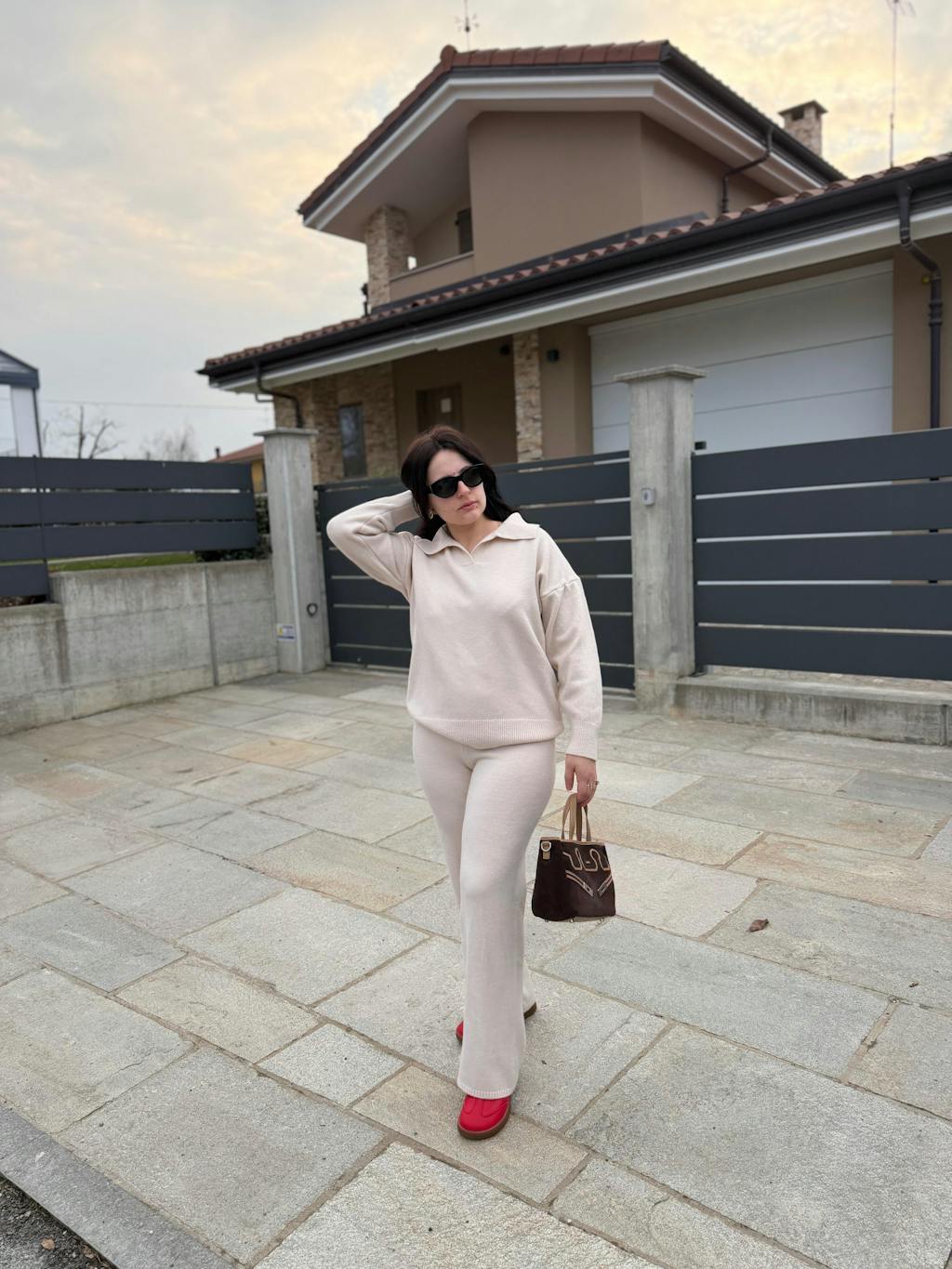 Flap collar, knit material, long sleeves, straight pants, set up, loose fit, casual |