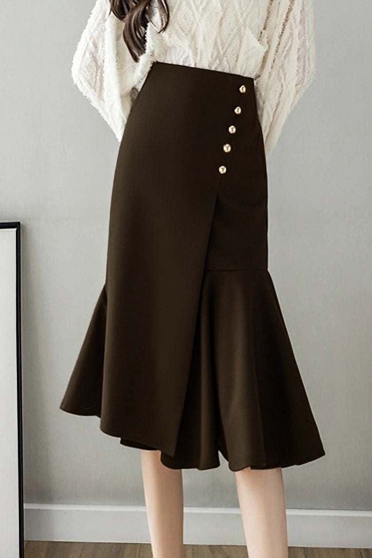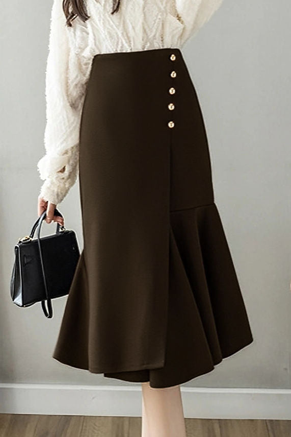Elegant Solid-Color Split Ruffle Midi Skirt