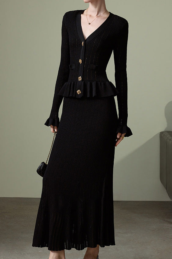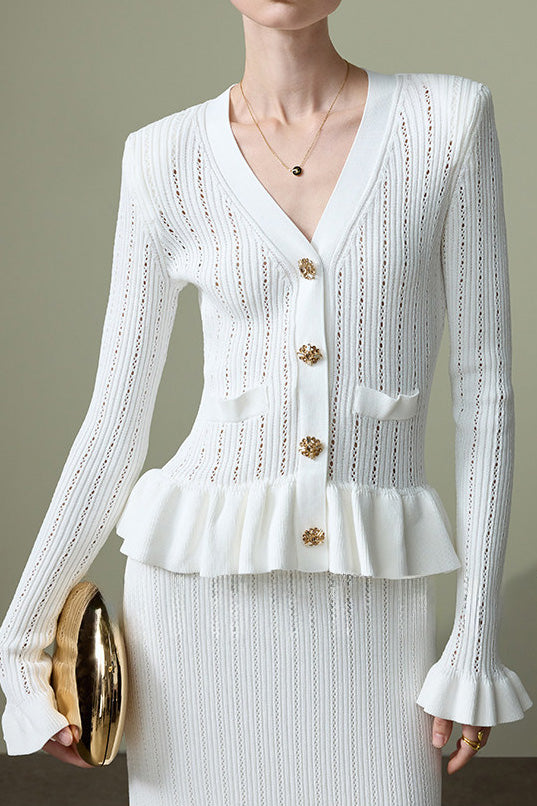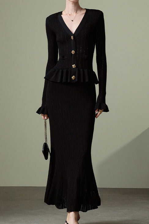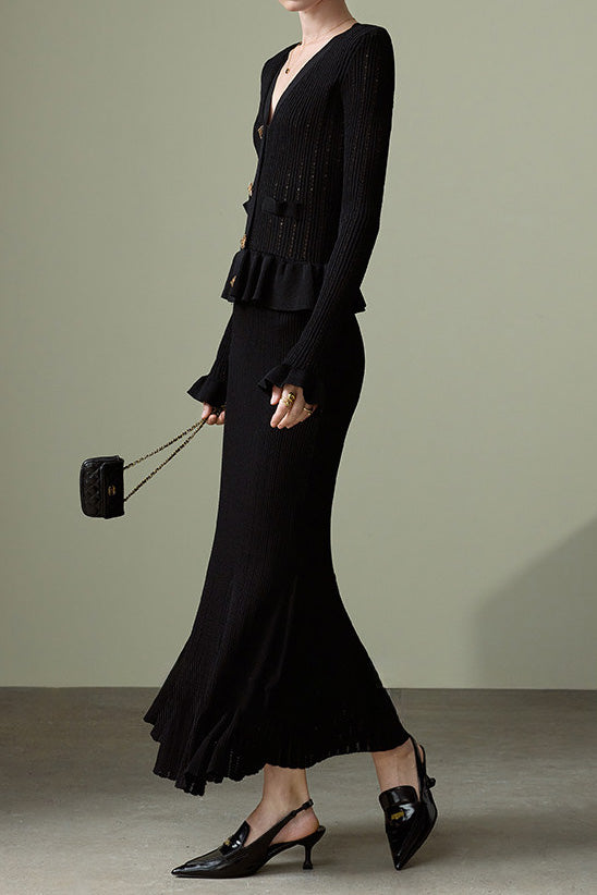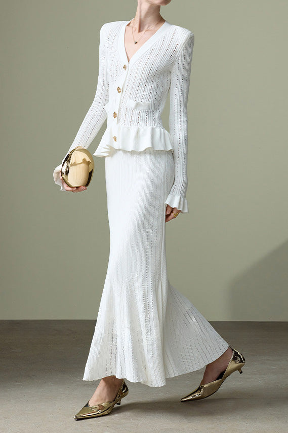Knitted Cardigan & Mermaid Skirt Two-Piece Set, V-neck single-breasted top with exquisite breathable hollow-out texture, ruffled hem for a feminine touch; matching slim-fit drapey midi skirt, elegant silhouette with perfect proportions |