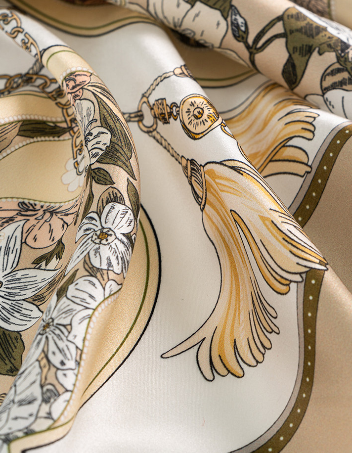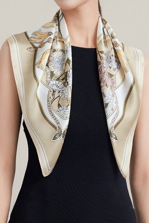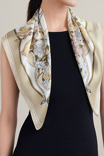 Mulberry Silk Square Scarf, printed with fortune flower pattern for an elegant and sophisticated look, can be worn as a neck scarf for versatile styling |