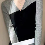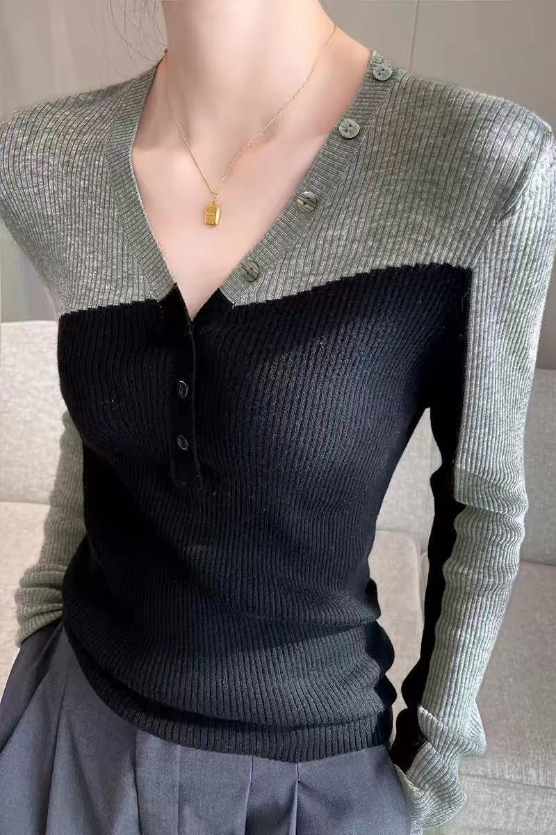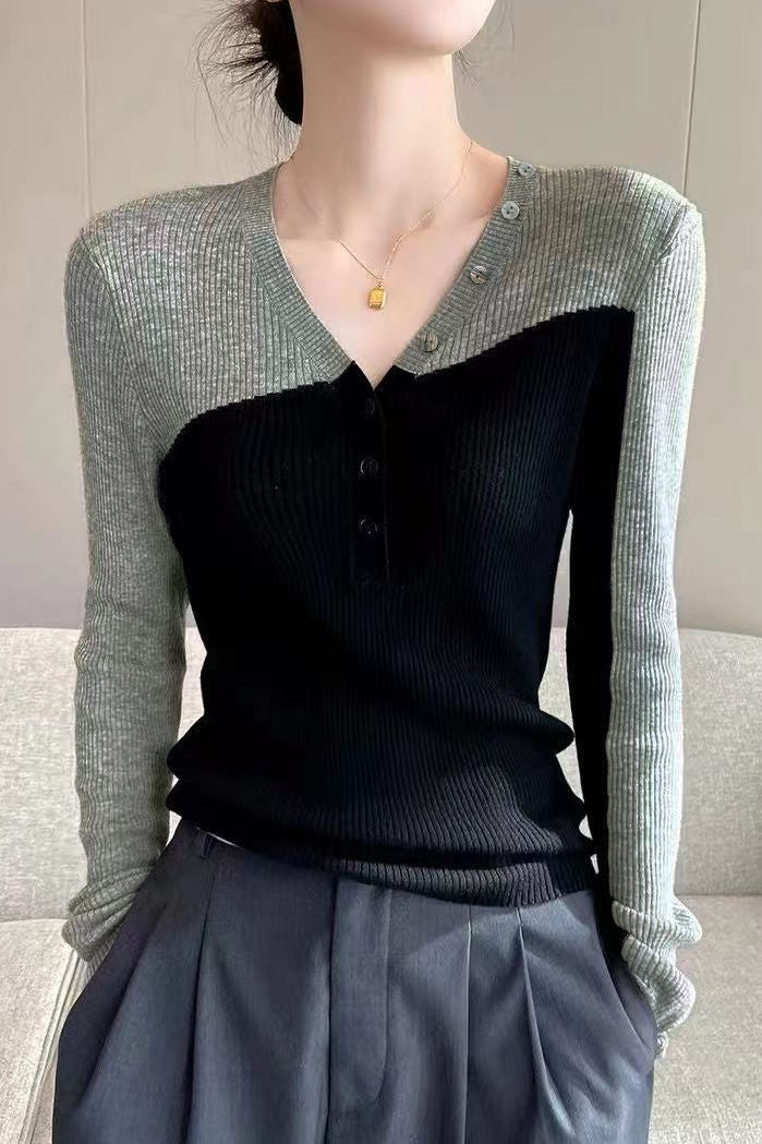 Knitted Top, V-neck half-placket design, well-defined color-block patchwork for layers, slimming ribbed texture, soft skin-friendly fabric, body-hugging fit combines comfort and fashion appeal |