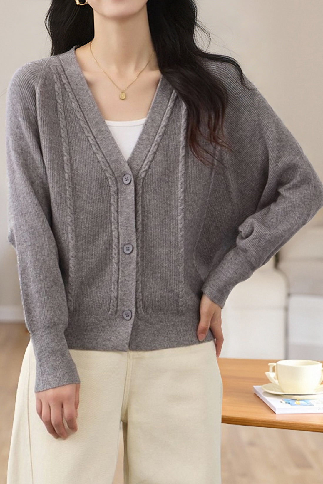Cardigan, V-neck batwing sleeve loose fit, vertical ribbed texture on main body, cable-knit detailing on both sides of placket, openable front buttons, ribbed trim at cuffs and hem for shape retention |