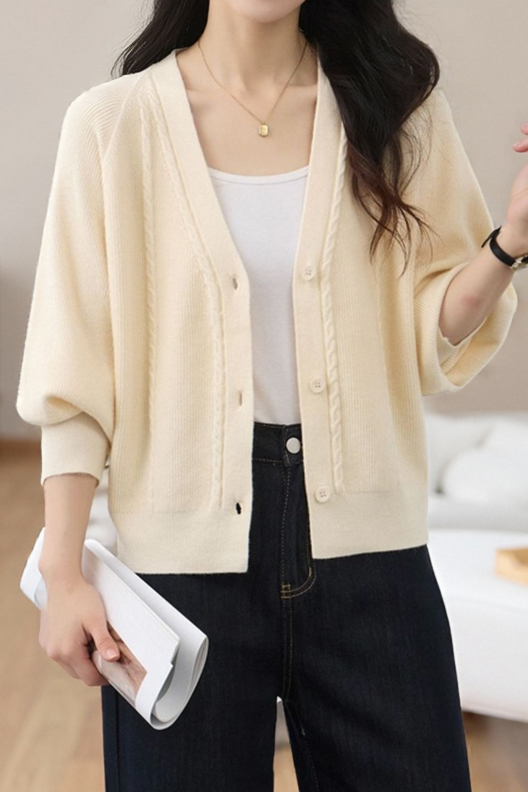 Casual Solid-Color Cable-Knit Batwing Sleeve Cardigan