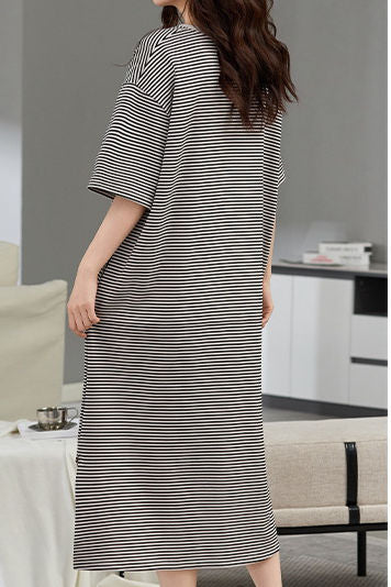 Dress, crew neck short-sleeve loose fit, all-over striped pattern, skin-friendly and antibacterial 100% cotton fabric, side split at hem for ease of movement |