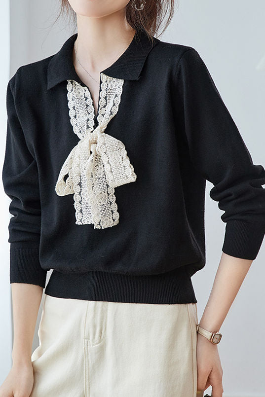 Elegant Lace Ribbon Long-Sleeve Knitted Top