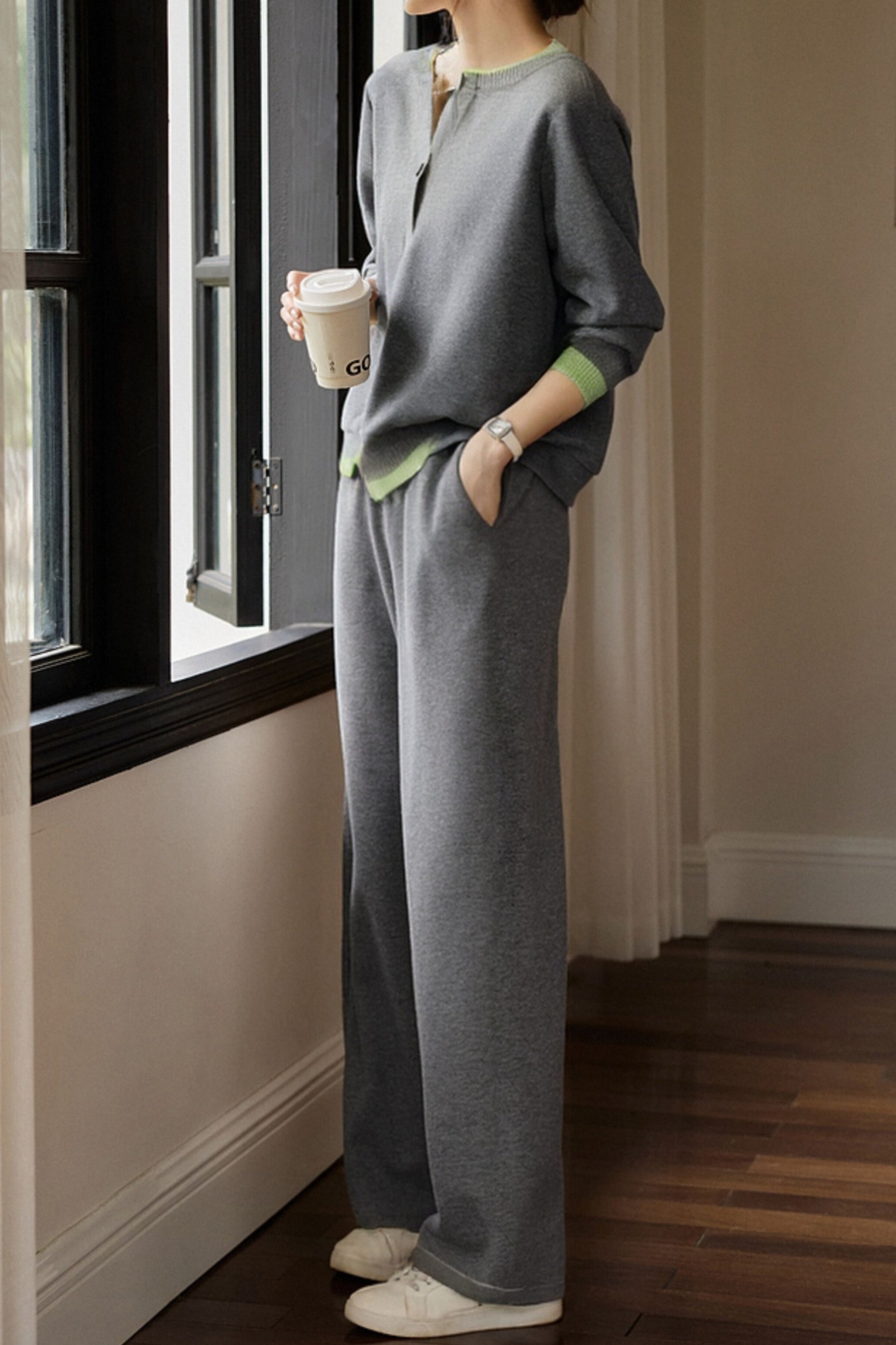 Casual Color-Block Trim Knitted Cardigan & Pants 2-Piece Set
