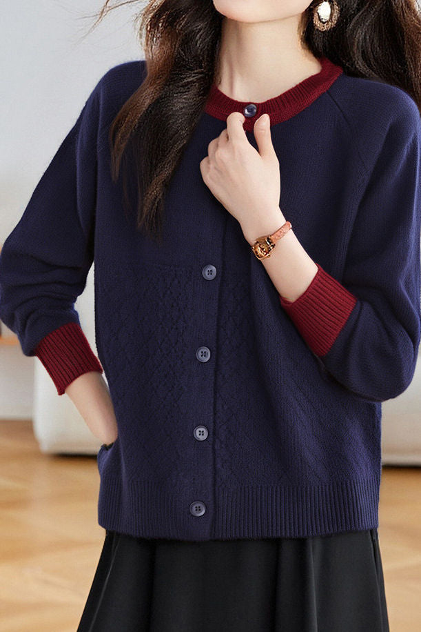 Casual Color-Block Argyle Jacquard Cardigan