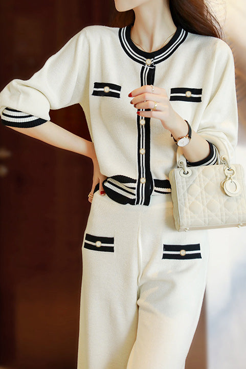 Elegant Temperament Color-Block Knitted Top And Wide-Leg Pants 2-piece Set