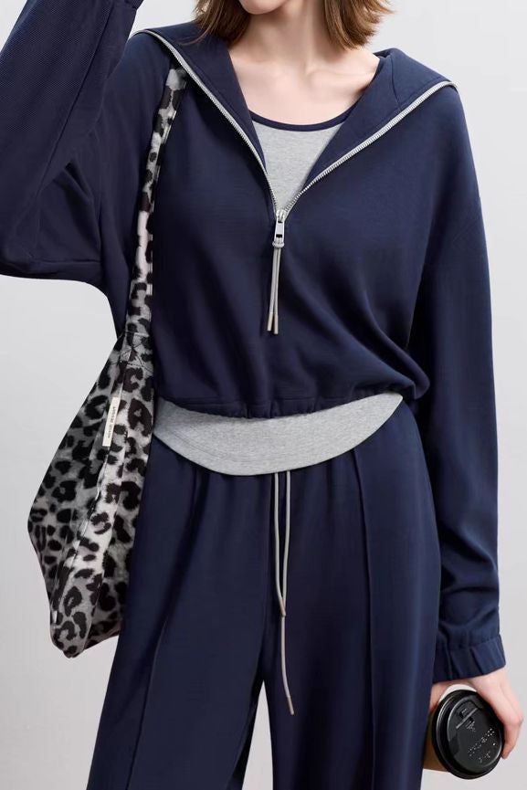Two-Piece Set: High Neck Color-Blocked Zip-Up Cardigan + Drawstring Maxi Knit Wide Pants - Available in 3 Colors
