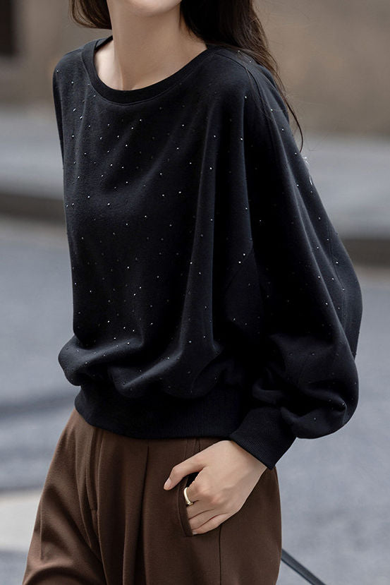 Casual Versatile Pullover Crew Neck Rhinestone Long-Sleeve Top