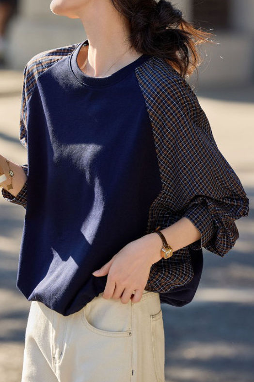 Casual Versatile Patchwork Plaid Pullover Hoodie