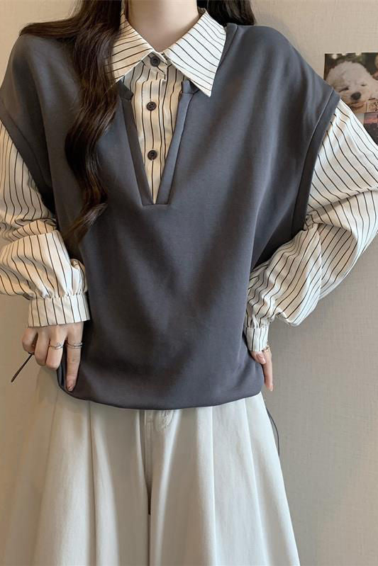 Striped Polo Collar Fake Two-Piece Long-Sleeve Sweatshirt