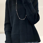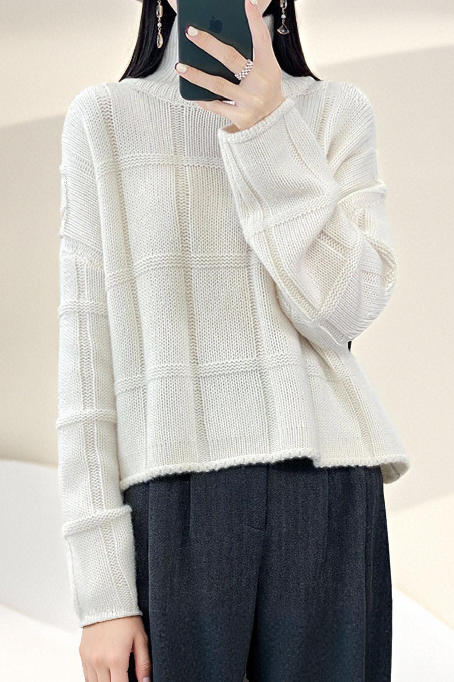 Pullover sweater, turtleneck long-sleeve loose fit, solid color, body decorated with plaid jacquard for added interest |