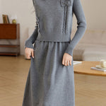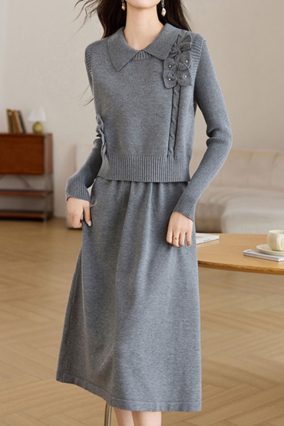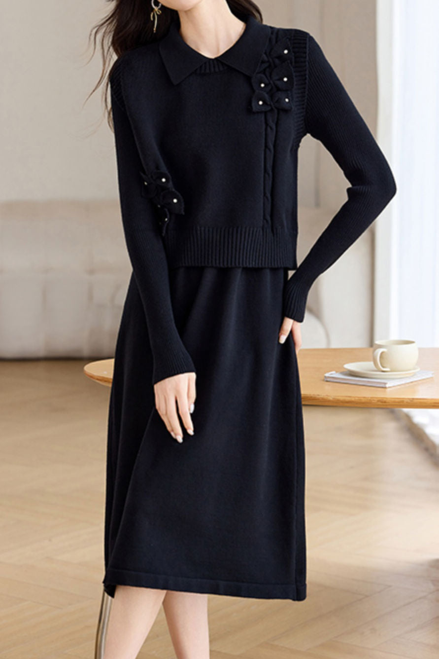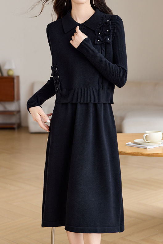 Vest and dress two-piece set, lapel design, body decorated with 3D floral ornaments for refinement, knitted texture for enhanced touch, loose and comfortable fit |