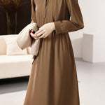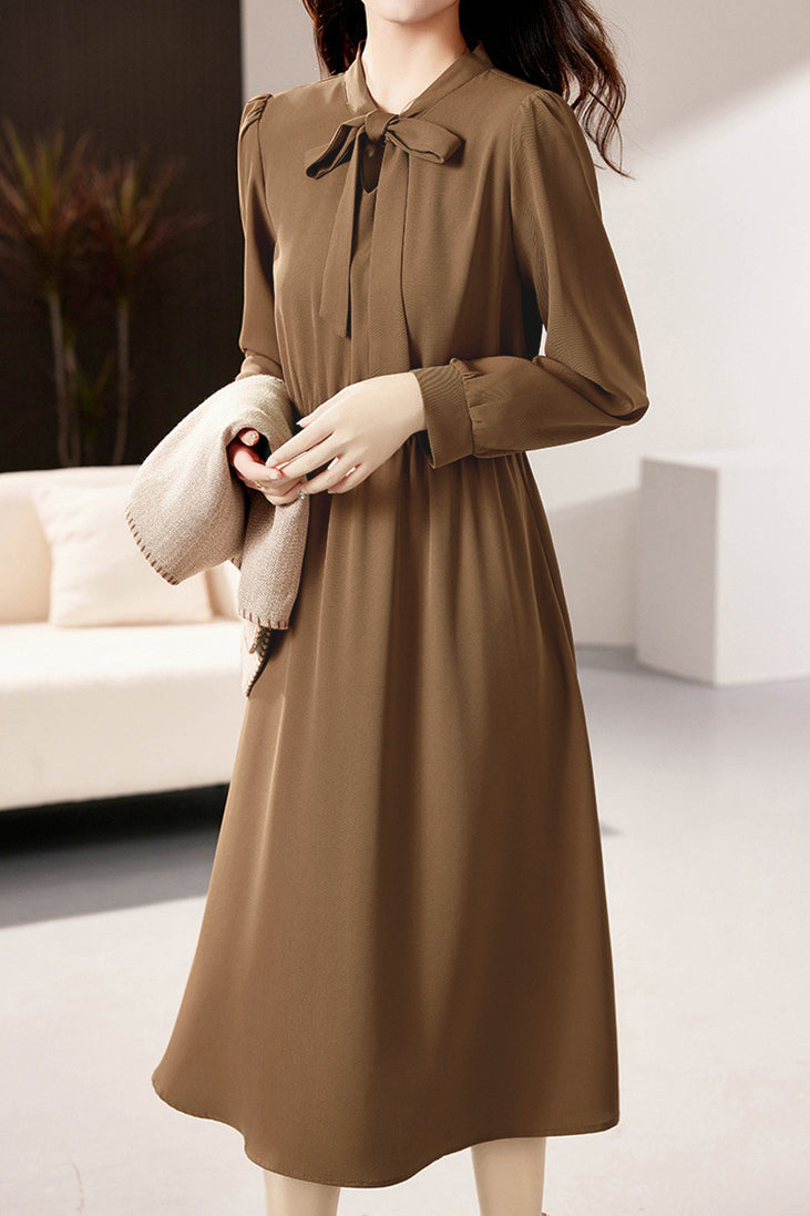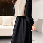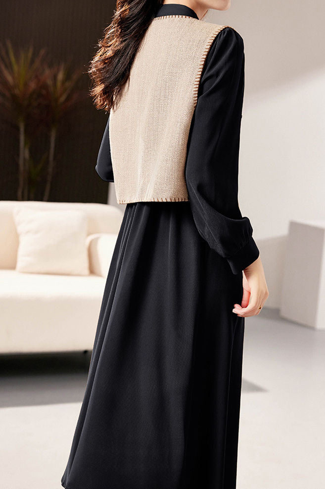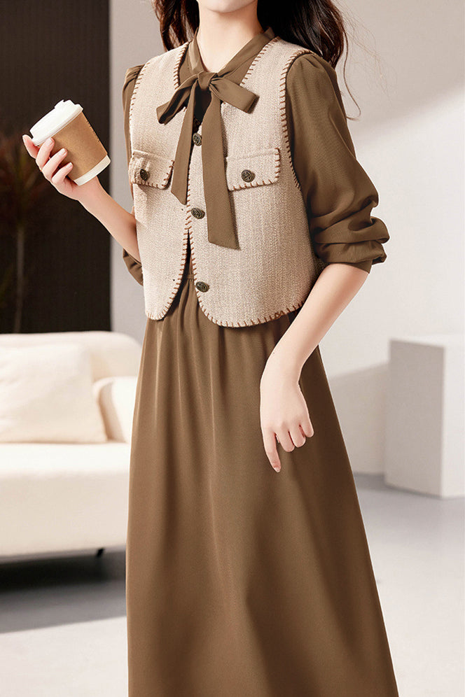 Vest and dress two-piece set, dress with waist cinching to accentuate waistline, vest with tweed texture and raw edge trim, decorated with metal buttons for refinement