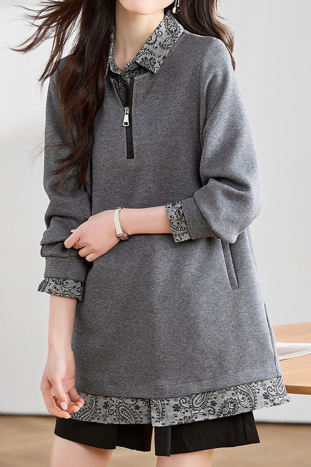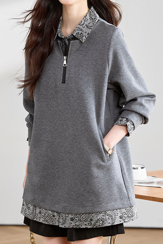 Casual Floral Lapel Fake Two-Piece Mid-Length Sweatshirt
