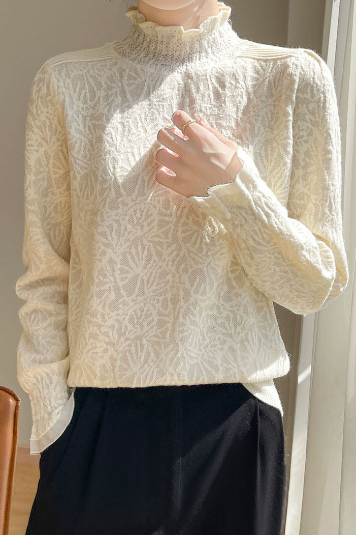 Casual Versatile Solid-Color Lace Ruffled Geometric Jacquard Knitted Top