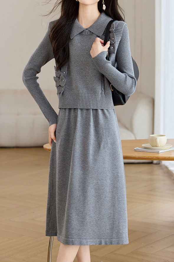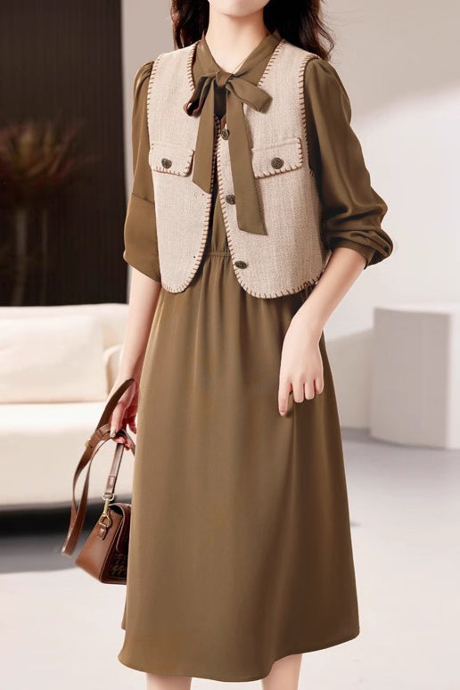 Casual Faux Layered Dress with Pleated Collar and Pearl Tie