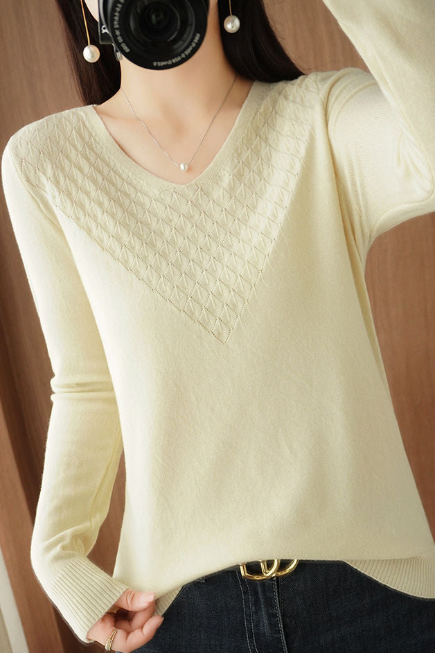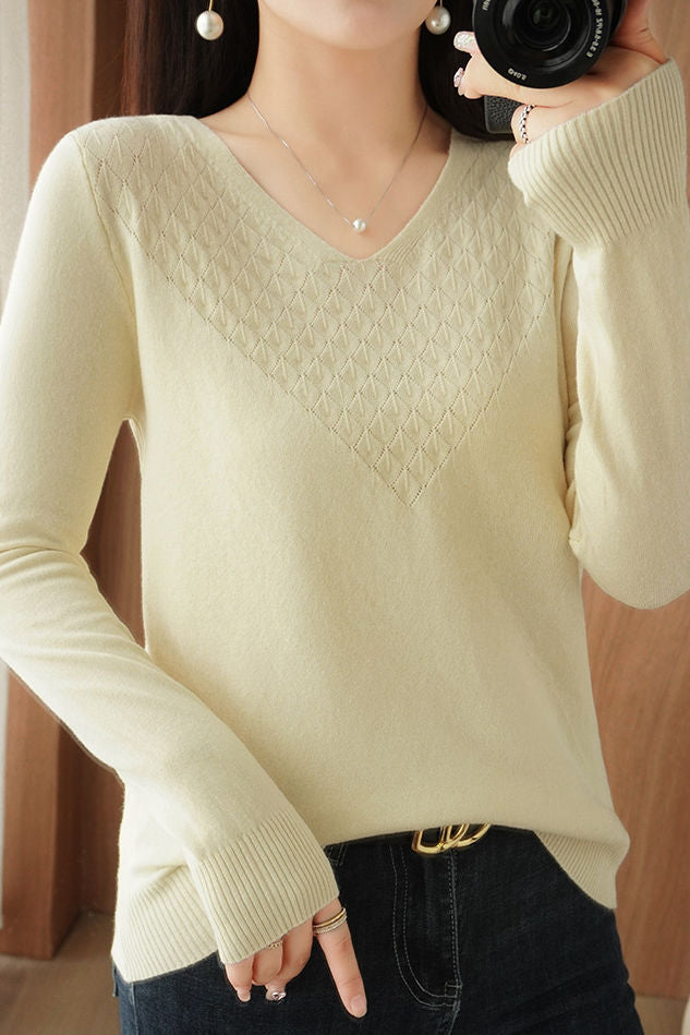 Casual V-Neck Jacquard Solid-Color Knitted Top