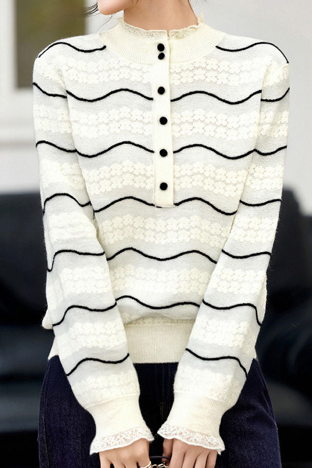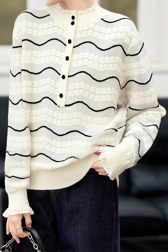 Casual Versatile Color-Block Wave-Striped Lace-Trimmed Knitted Top