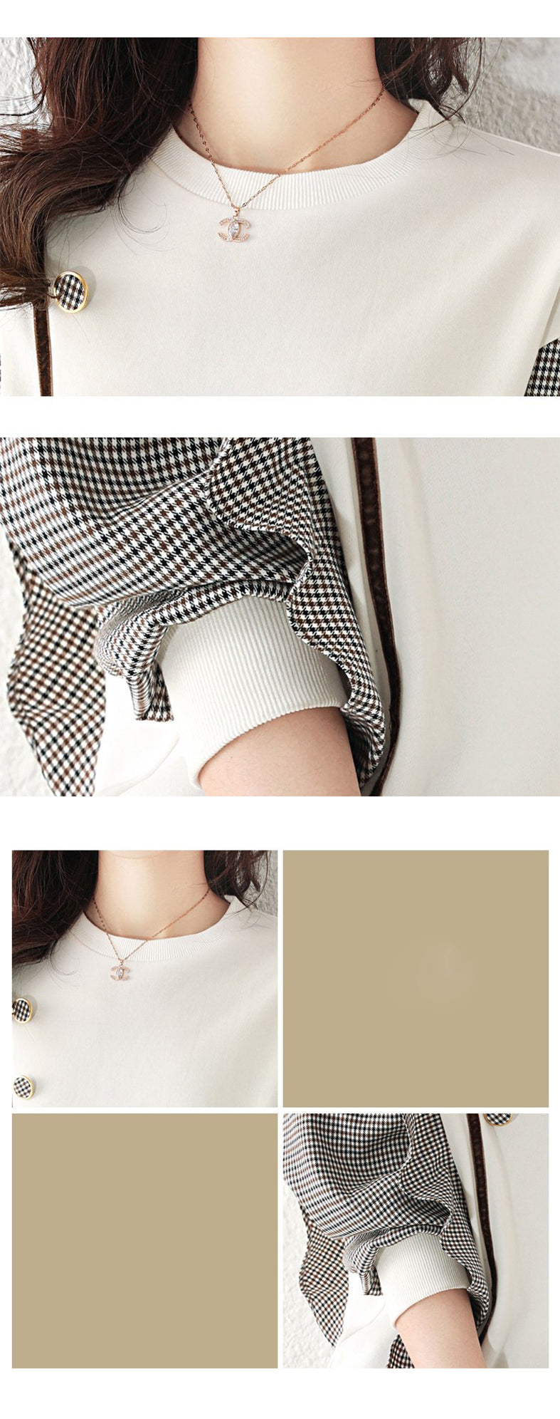 Round neck, long sleeves, check pattern, puff sleeves, frill switch design, button decoration |