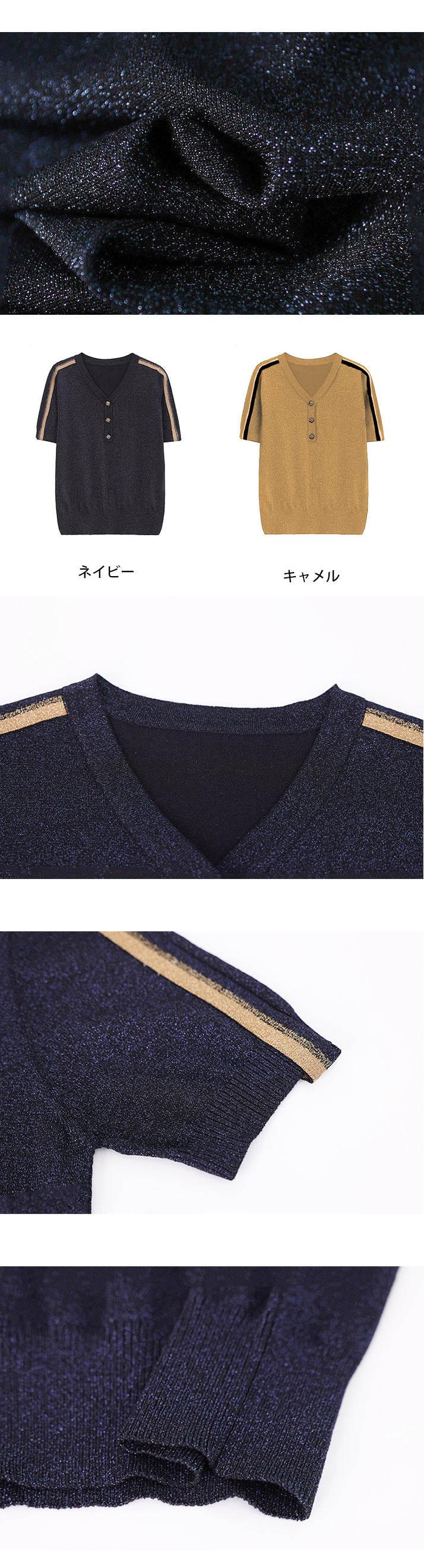 無地、ボタン付き、Vネック、半袖、リブ切替 |