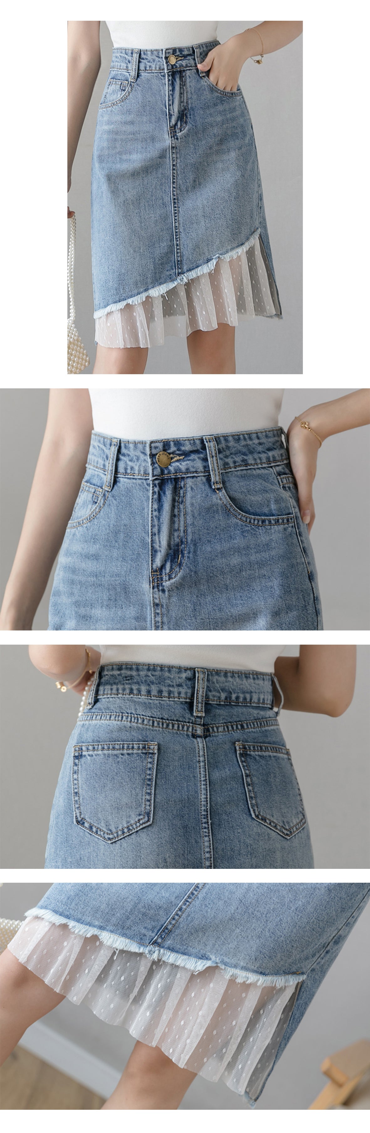 High waist, front concealed zipper, with watch pocket, with back patch pockets, denim material, straight design, pleated tulle switch, gathered design, solid color, knee length, wide hem |