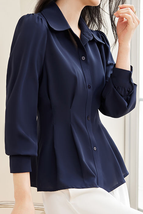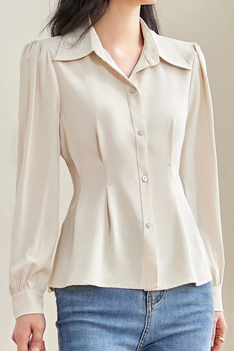 Blouse, Solid Color, Polo Collar Long Sleeves, Front Center Button Closure, Pleated Design Below Waist, Cuff Button Closure |