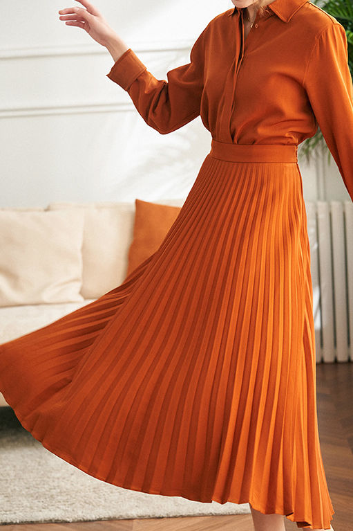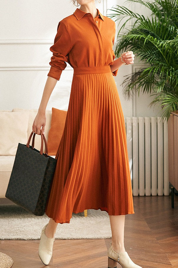 Dress, Polo Collar Long Sleeves, Hidden Buttons on Front Placket, Cuff Button Closure, Solid Color Design, Side Zipper on Right Waist |
