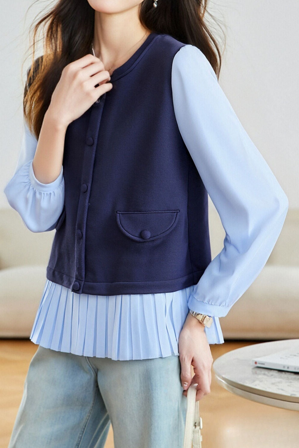 Exquisite Elegant Pleated Color-Blocked Knit Top