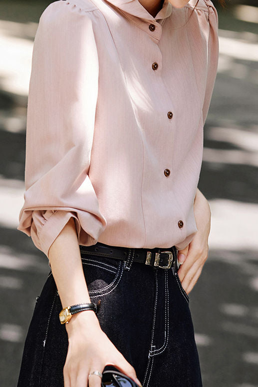 Blouse, Solid Color, Polo Collar Long Sleeves, Button Closure at Front Center, Button Closure Design on Cuffs |