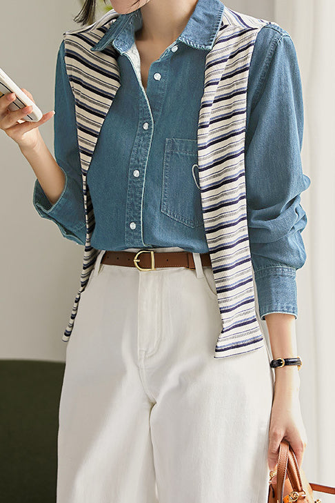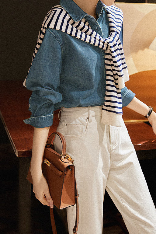 Denim Shirt, Solid Color, Polo Collar Long Sleeves, Pocket Design on Left Chest, Heart Embroidery Decoration on Pocket, Single-Row Button Closure on Front Placket |