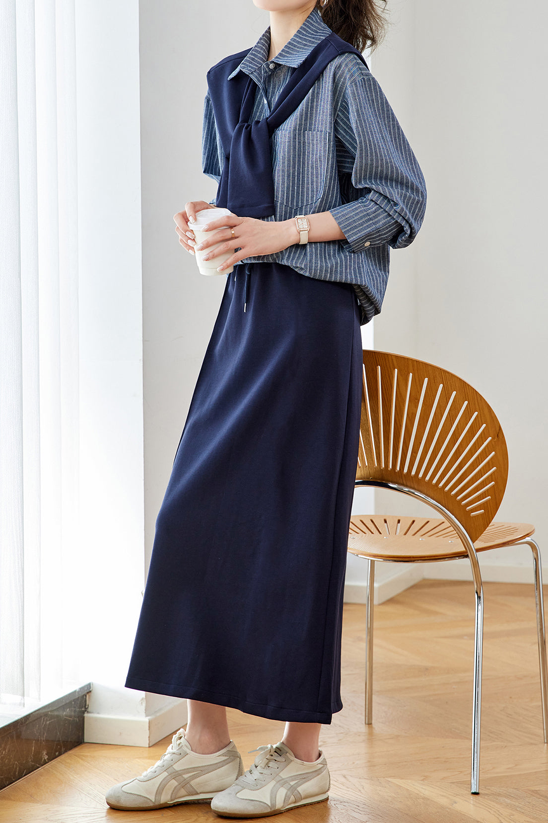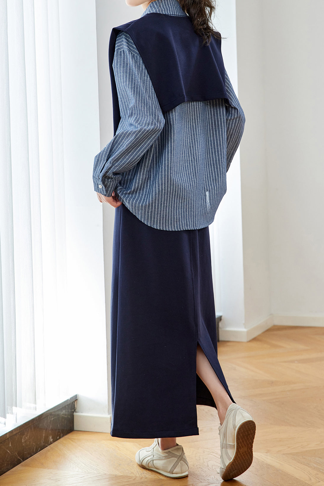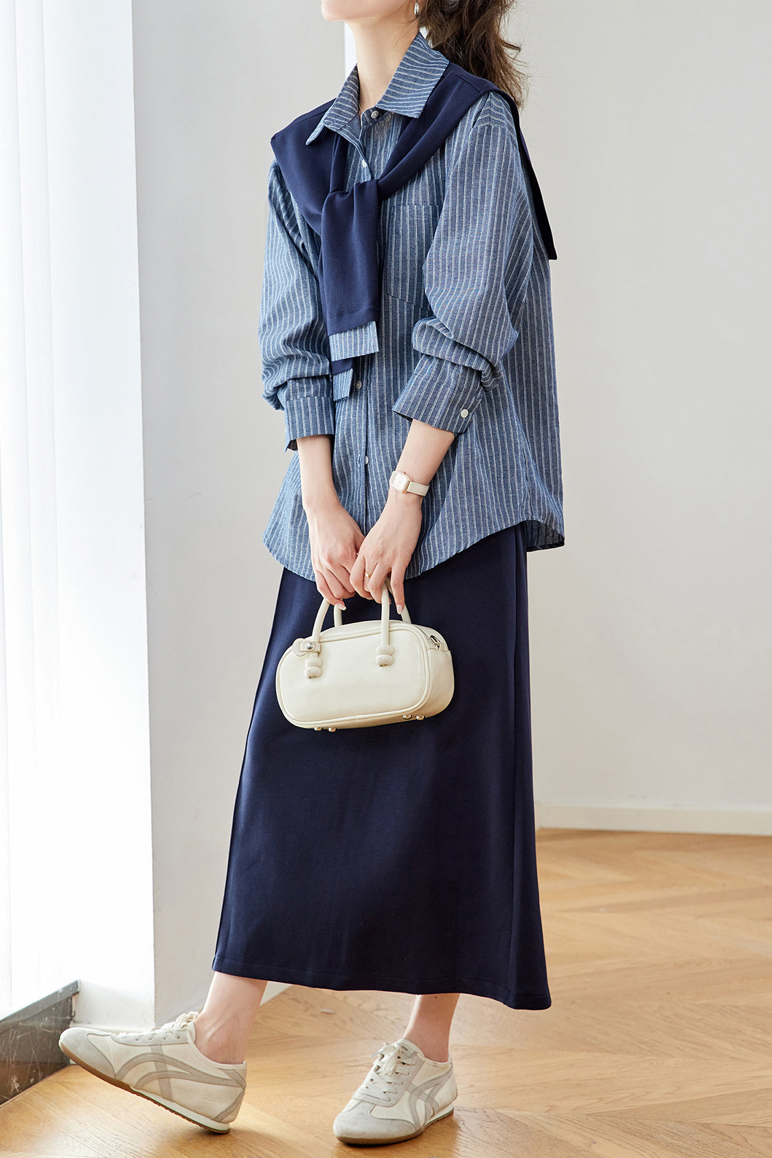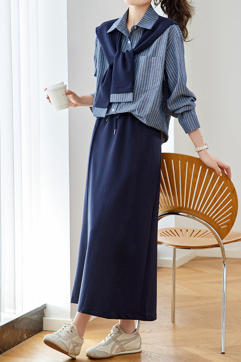 Set: Shirt, Polo long sleeves, striped color, front button closure, cuffs with button closure, left chest pocket design; Skirt, zipper and button design at waist, elastic band at back, adjustable drawstring, loose straight fit, back slit design at hem, paired with a non-stretch sheer shawl |
