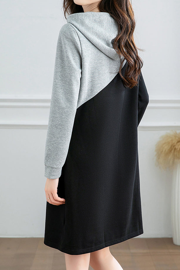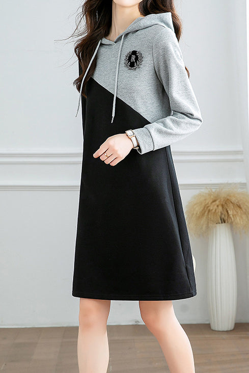 Dress, hooded long sleeves, adjustable drawstring, color-block design, left chest decorated with rhinestone velvet pattern |