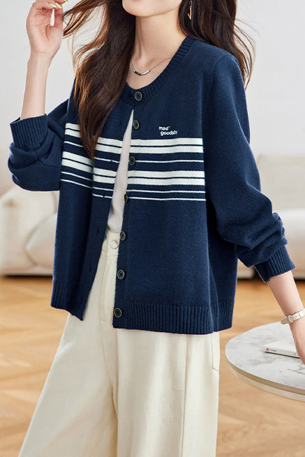 Knit cardigan in solid color, round neck, front button closure, long sleeves, loose fit, striped design, left chest with letter embroidery |