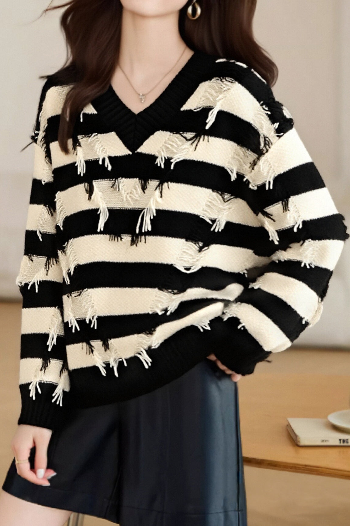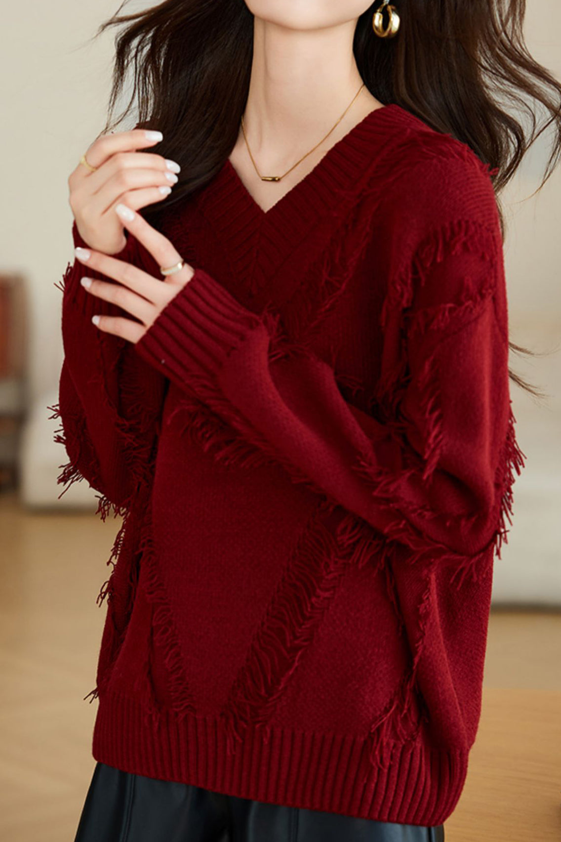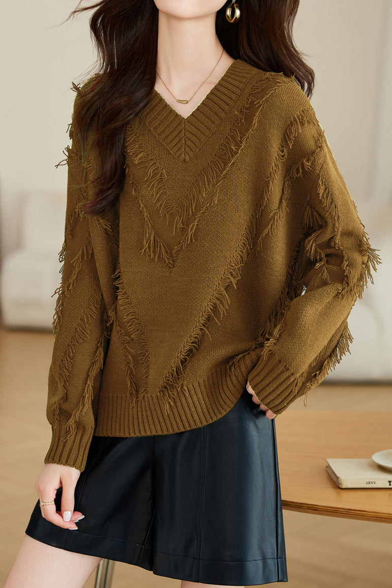 Knit top with V-neck, long sleeves, loose fit, and fringe design on the front |