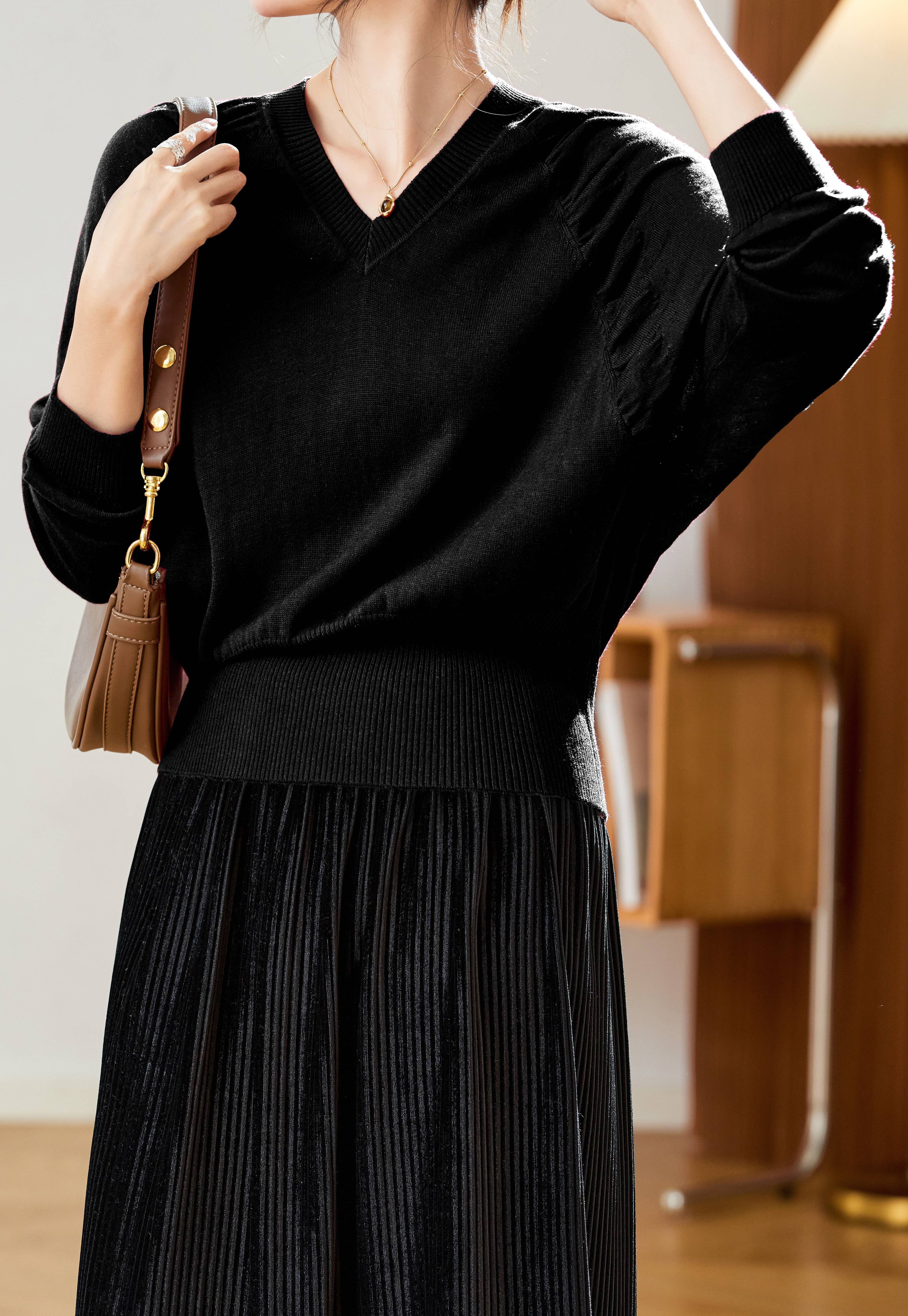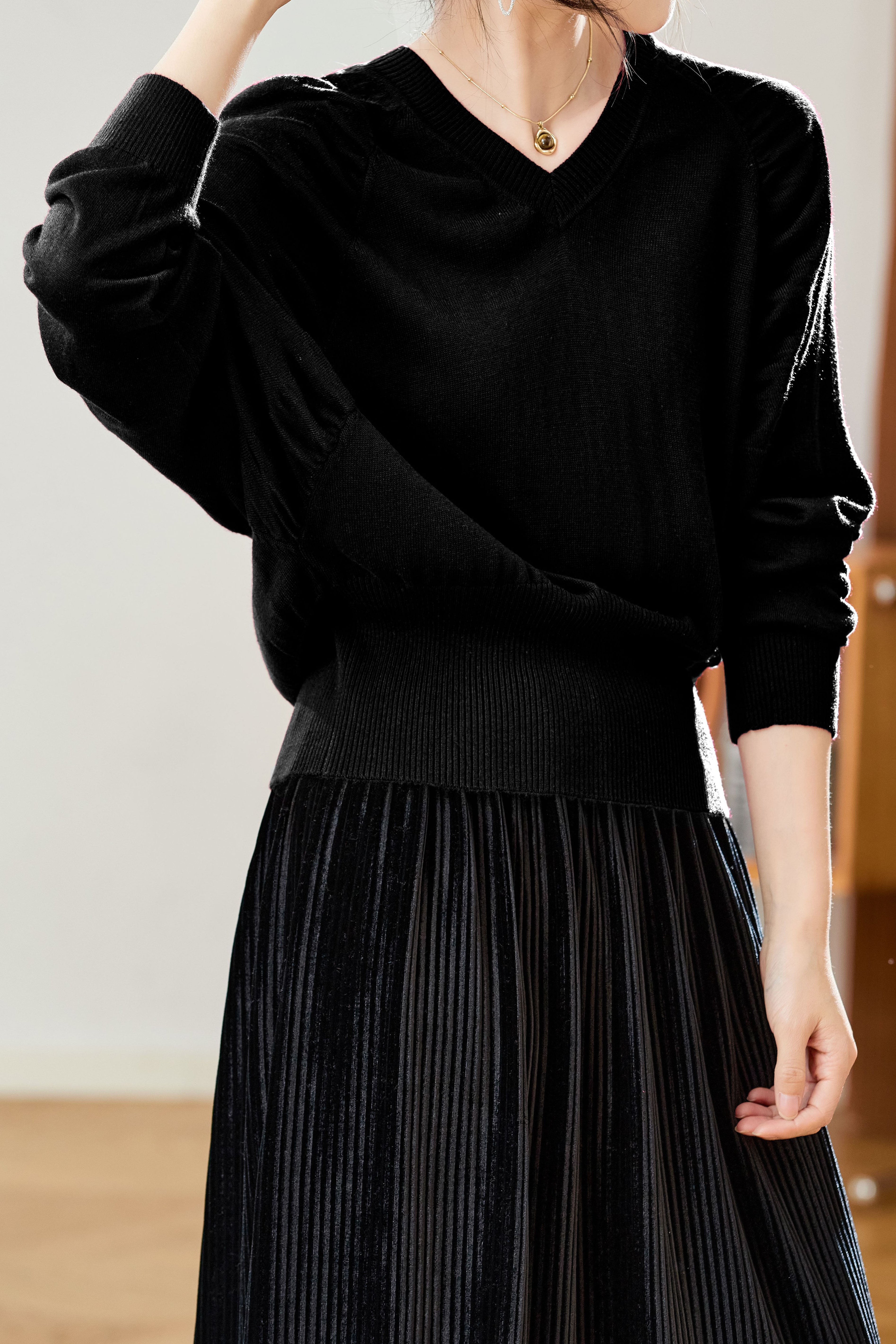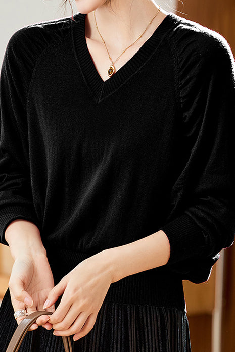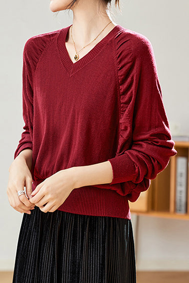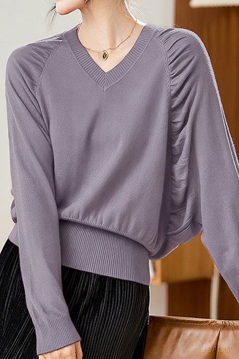 Knit top in solid color, V-neck, batwing sleeves with gathered design, loose fit, and waist-defining design |