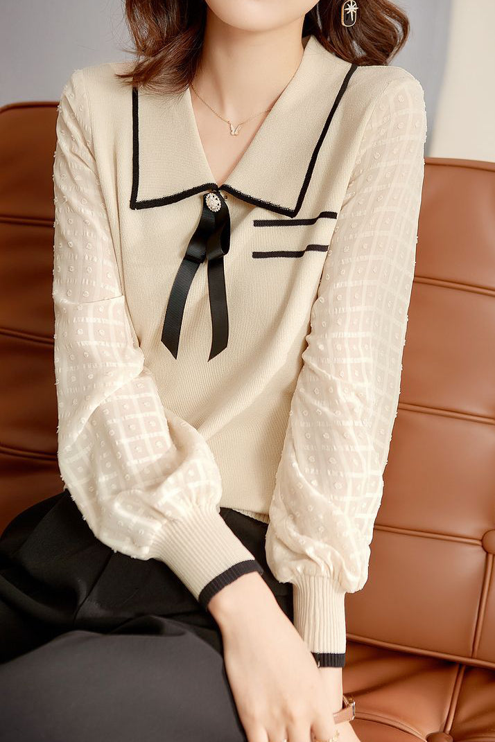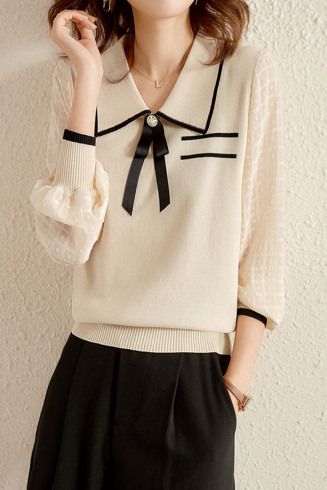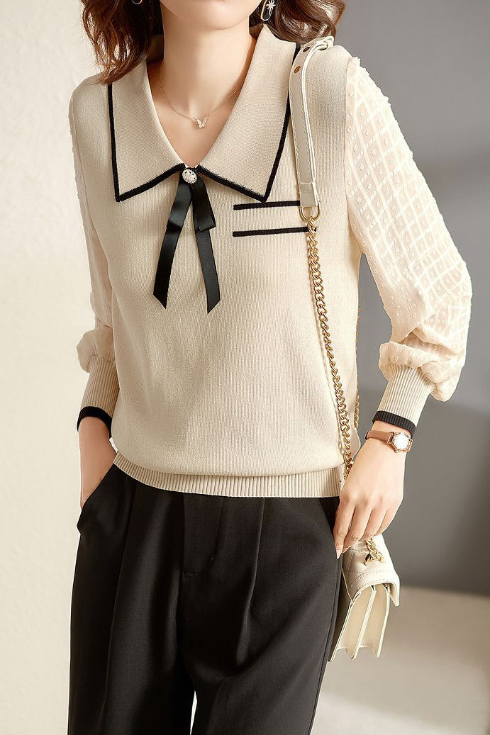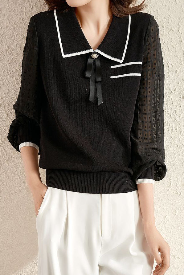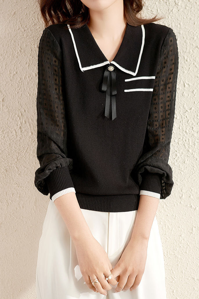 Knit top with polo collar, long sleeves, color-block collar, striped pattern on the left chest, and a bow tie brooch accessory |