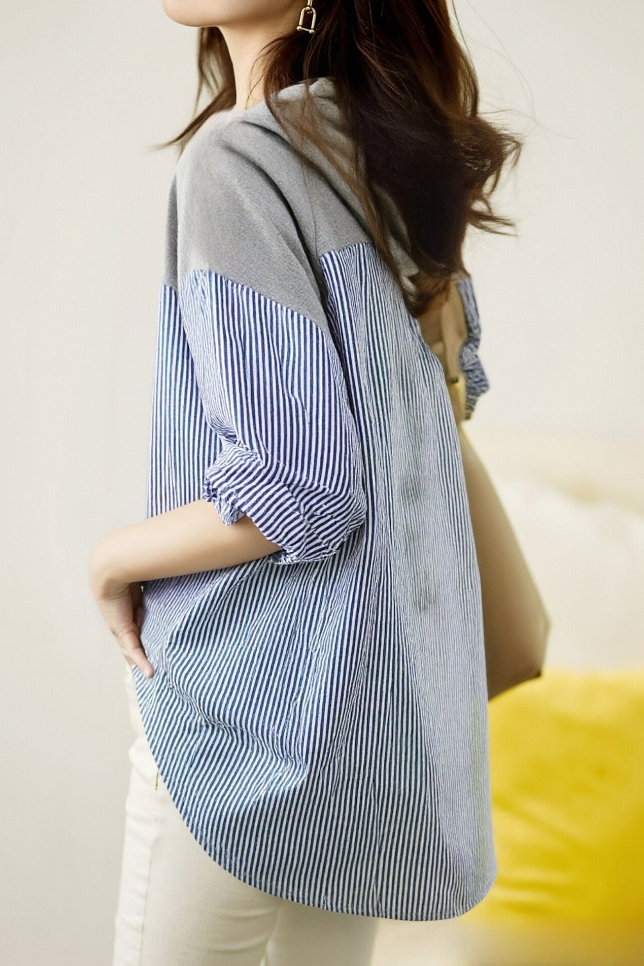 Hooded shirt in striped woven fabric with knit fabric, slightly stretchy, striped patchwork design, adjustable drawstring on the hood, front button closure, left chest patch pocket, and loose raglan long sleeves |