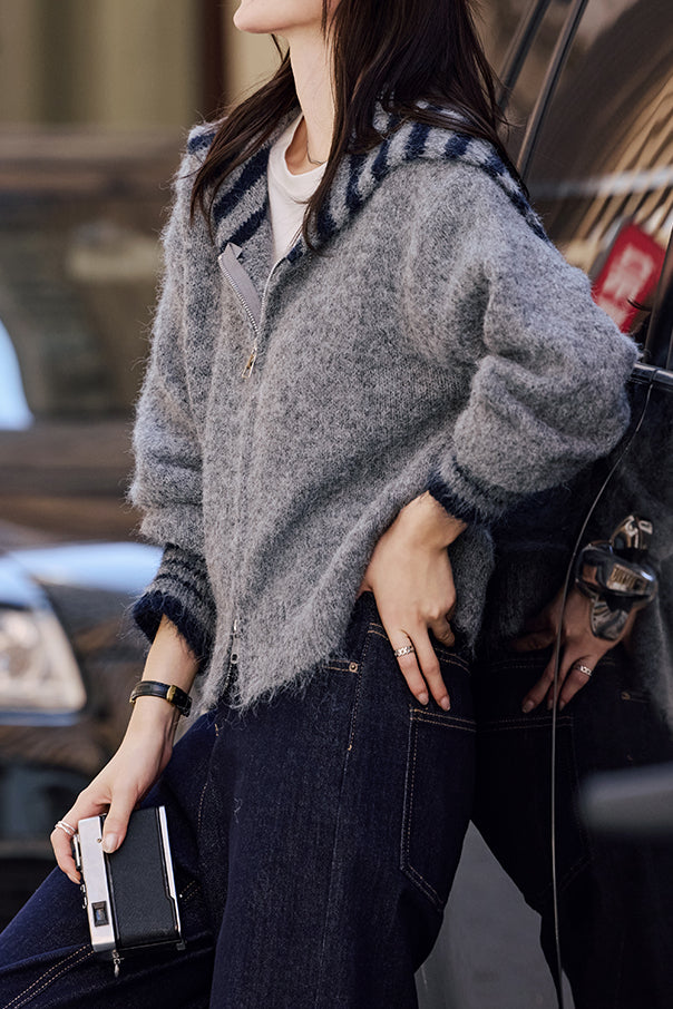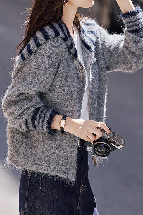 Jacket with navy collar and long sleeves, front double-headed zipper design, color-block striped details on the collar and cuffs |