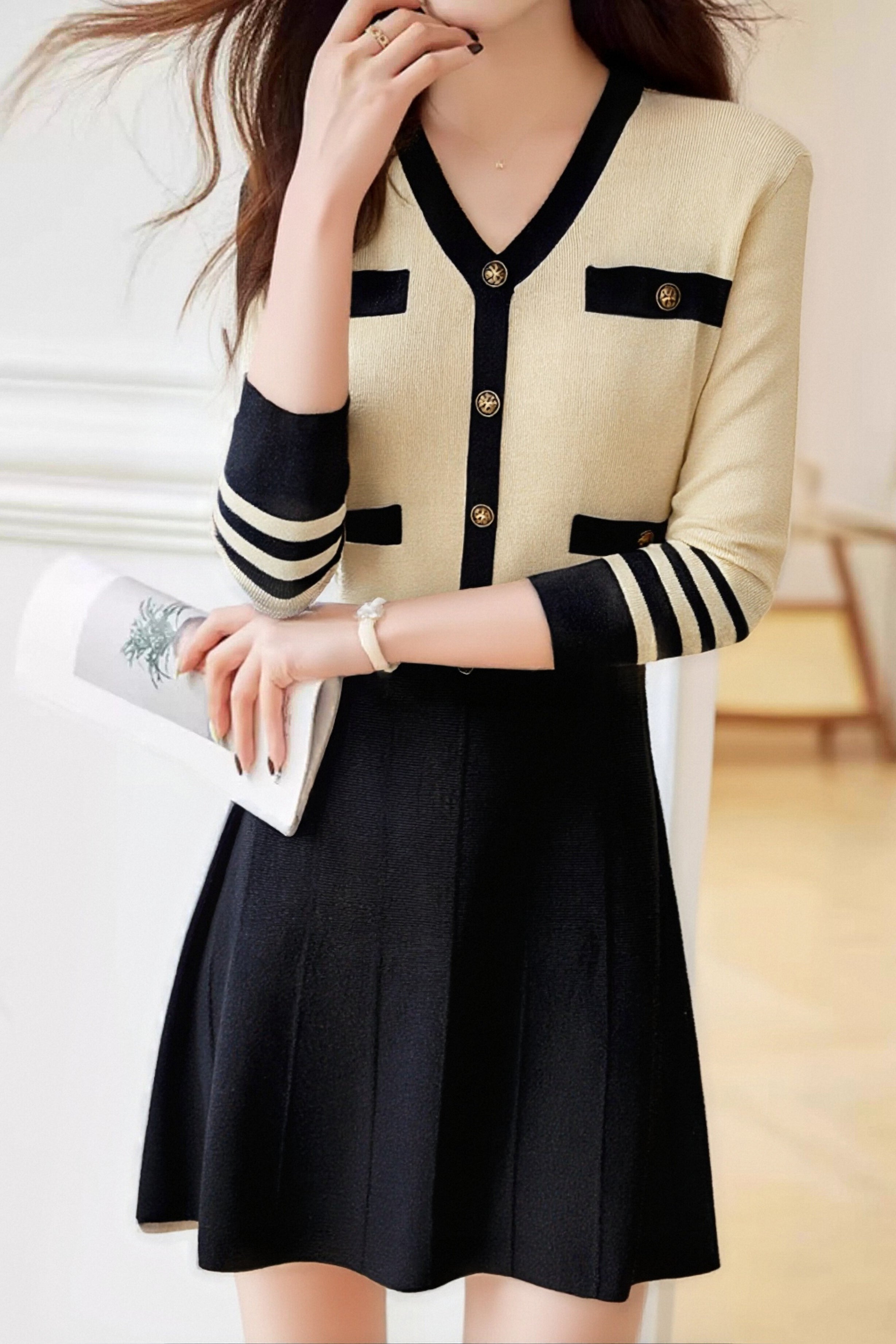 Knitted dress,v-neck,front center with decorative buttons,upper section with color-block trim design,waist-cinched a-line fit |