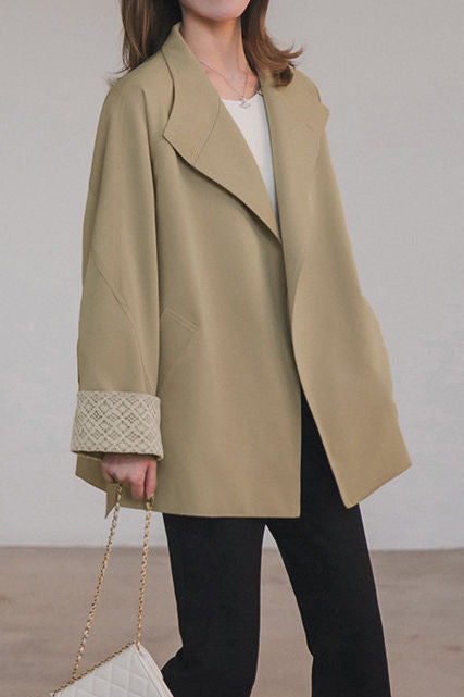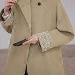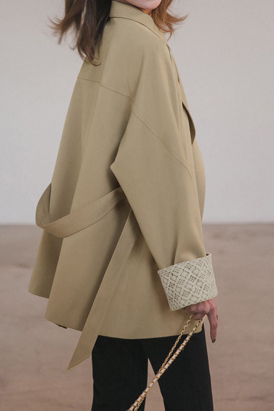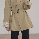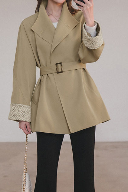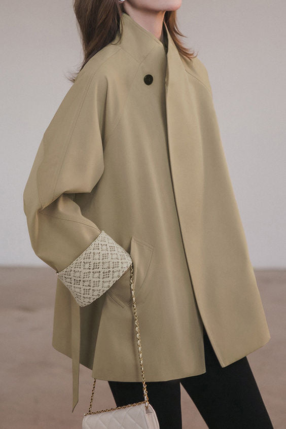 Trench coat,solid color,stand collar front placket,neckline with one unbuttonable button,waist with adjustable belt,side insert pockets,raglan long sleeves,cuffs paneled with exquisite hollow lace design,loose a-line fit |