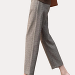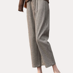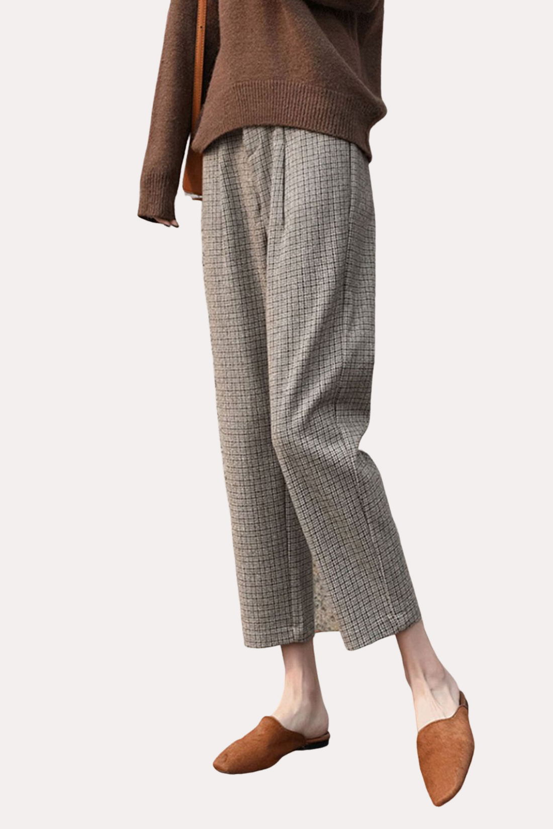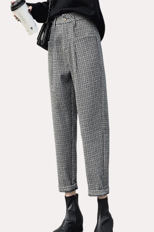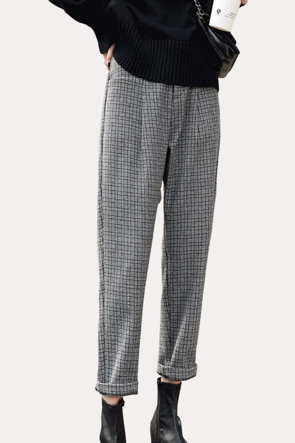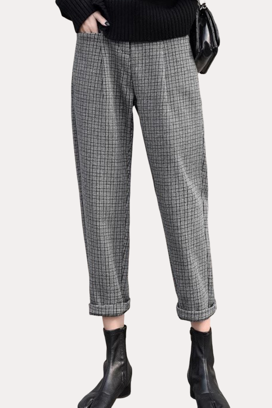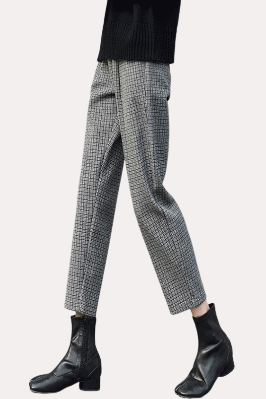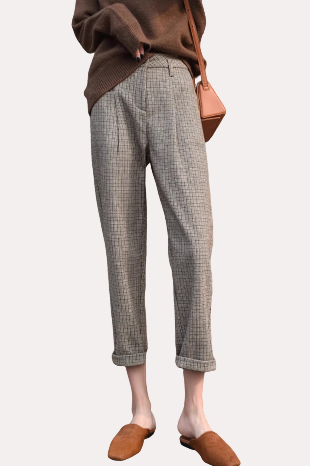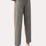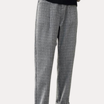 Pants, brushed woolen material, houndstooth pattern, front with unzippable zipper and unbuttonable buttons, front with insert pockets, tapered fit |
