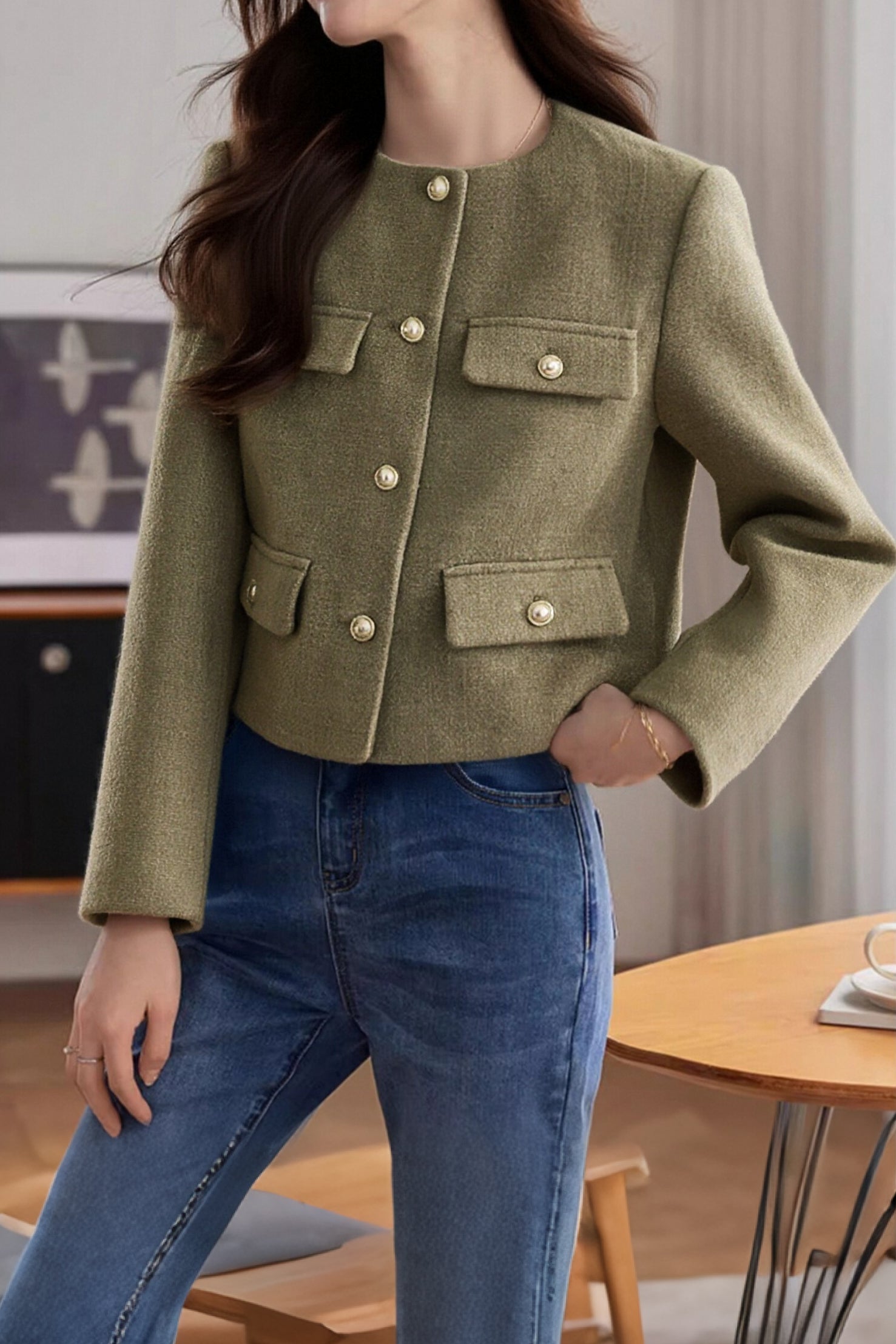 Jacket, crew neck long sleeves, front placket with unbuttonable buttons, front with four faux pockets |