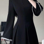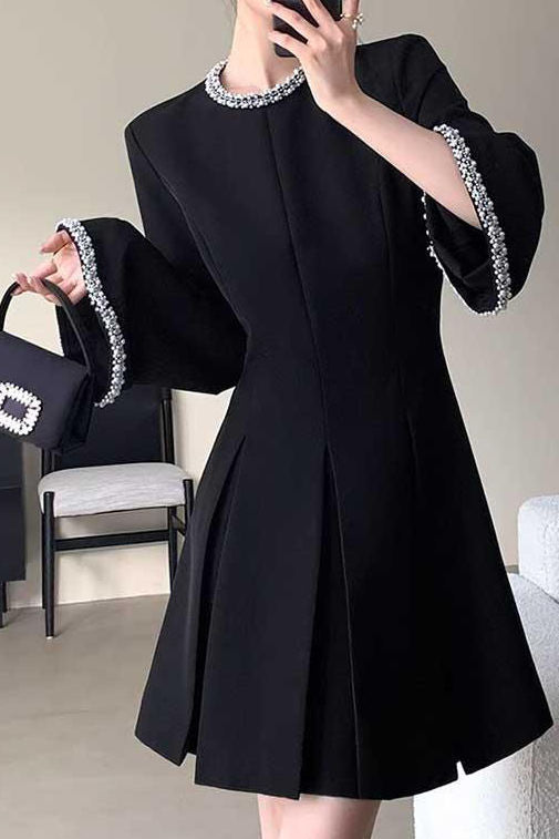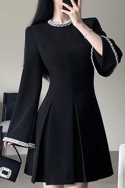 Dress,crew neck fitted-waist long-sleeve fit,with bead decoration on neckline and cuffs,pleated skirt hem design,invisible zipper at back center |