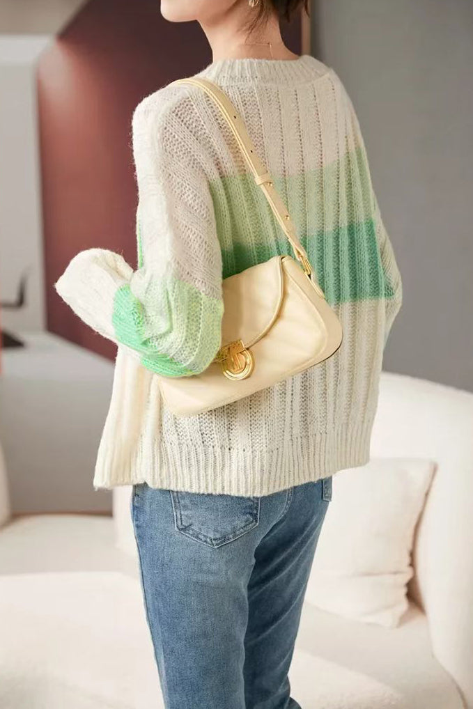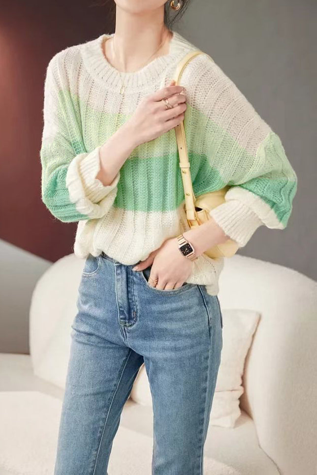 Casual Versatile Color-Block Striped Crew Neck Pullover Sweater