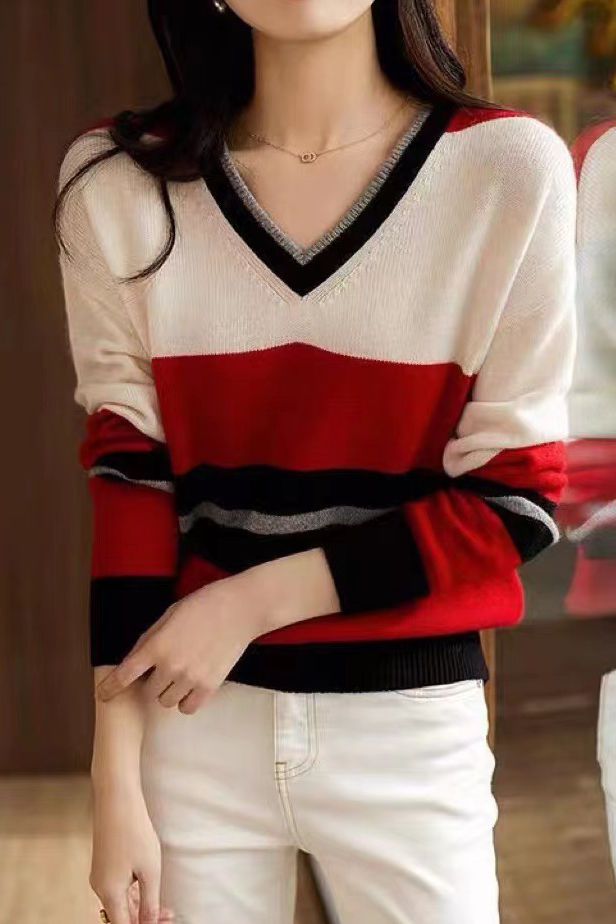 Casual Versatile V-Neck Color-Block Striped Pullover Knitted Top