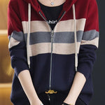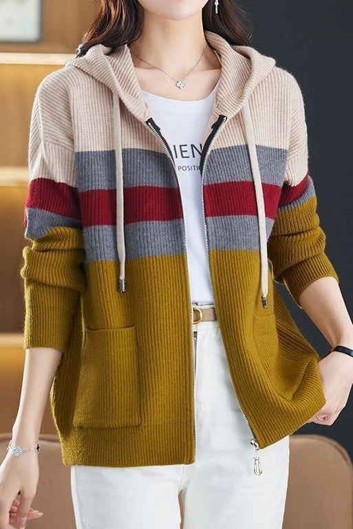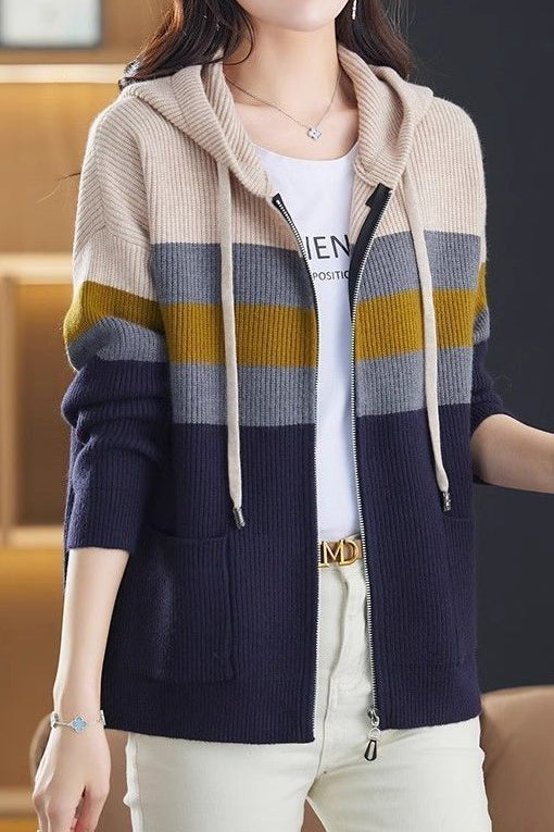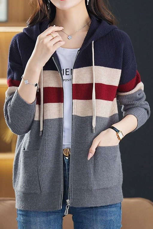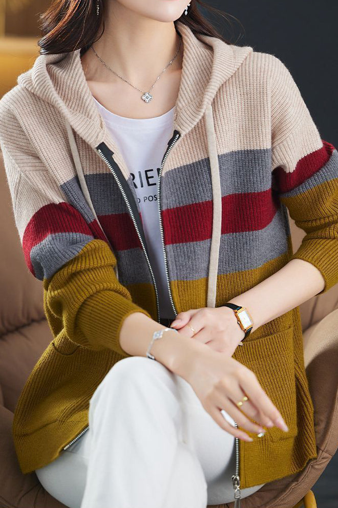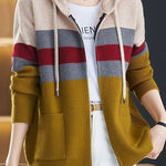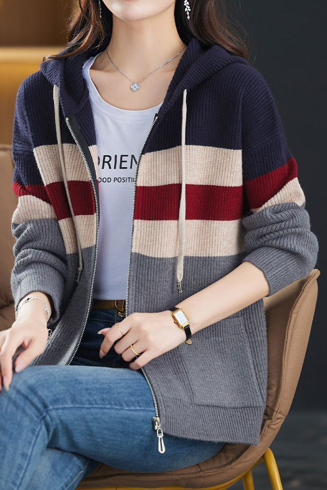 Casual Versatile Color-Block Hooded Zipper Knitted Cardigan