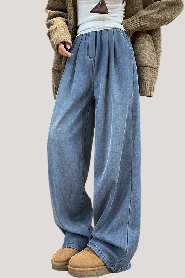 Fleece-lined wide-leg pants,waistband with elastic,front waist pleated design,side pockets on both sides,lyocell fabric with fleece and washed vintage finish |