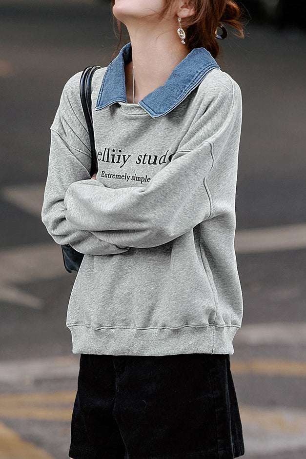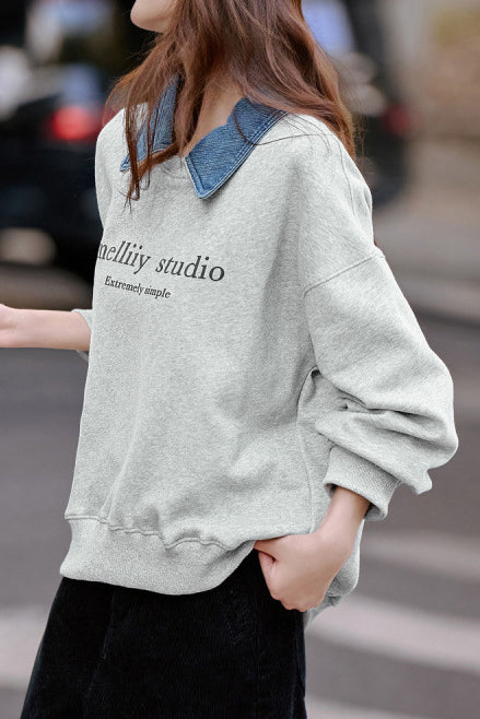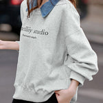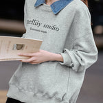Pullover hoodie,lapel denim fake two-piece design,long-sleeve loose fit,letter print design on front chest |
